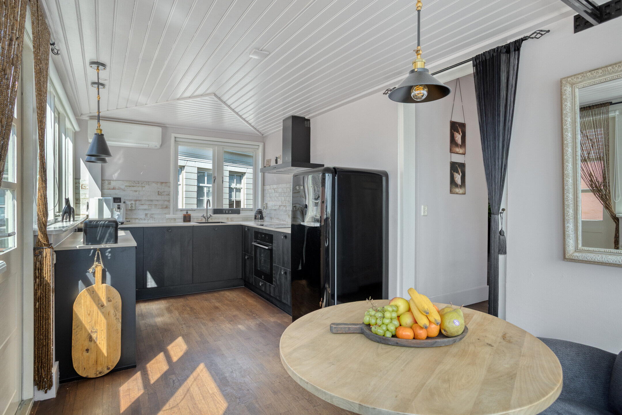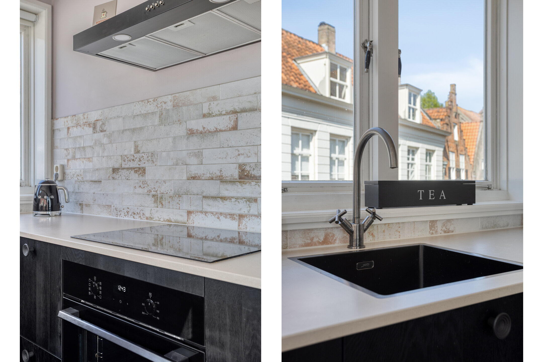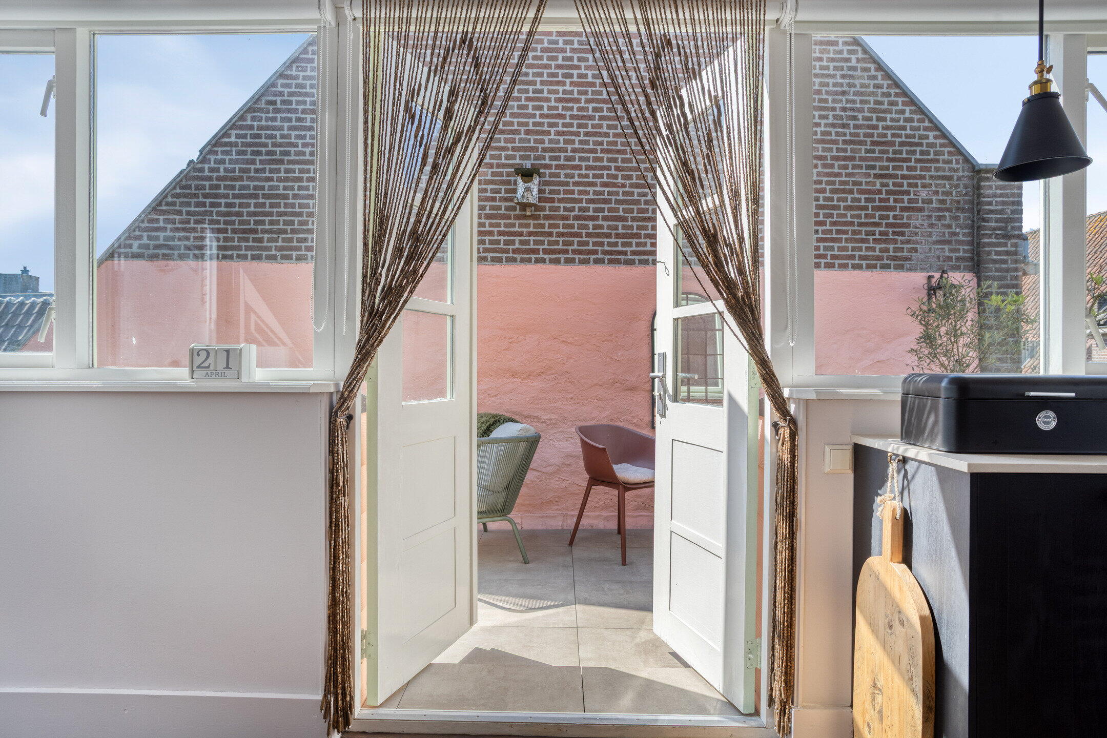 De woonkeuken is licht en biedt volop ruimte voor een eettafel. De keuken is in 2024 vernieuwd en praktisch ingericht met een moderne zwarte hoekopstelling en voorzien van diverse inbouwapparatuur. Via de dubbele deuren stap je zo het dakterras op. Extra comfortabel: de woonkeuken is voorzien van airconditioning die ook kan verwarmen – een zeldzame luxe in de vesting.