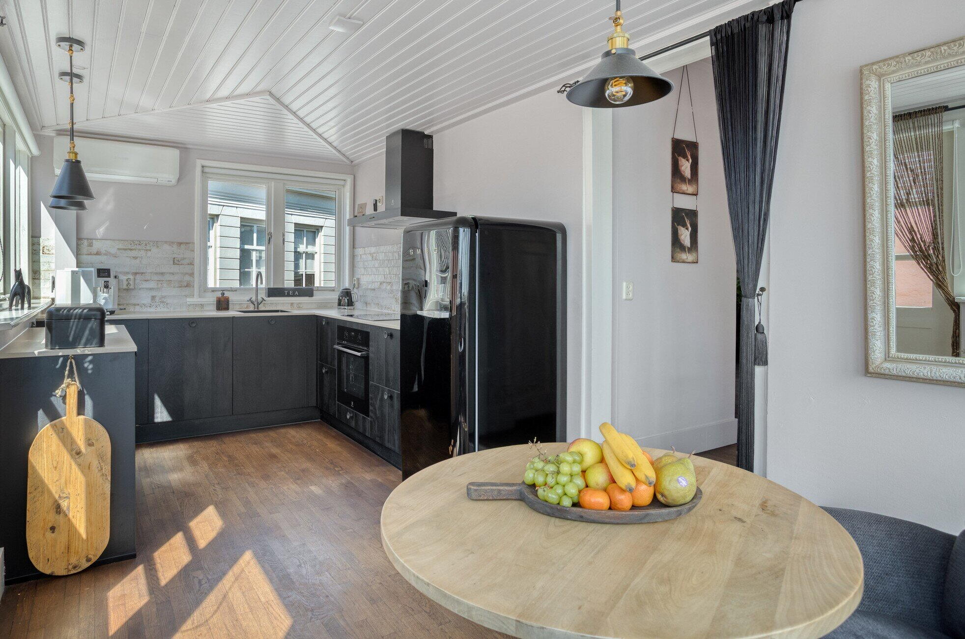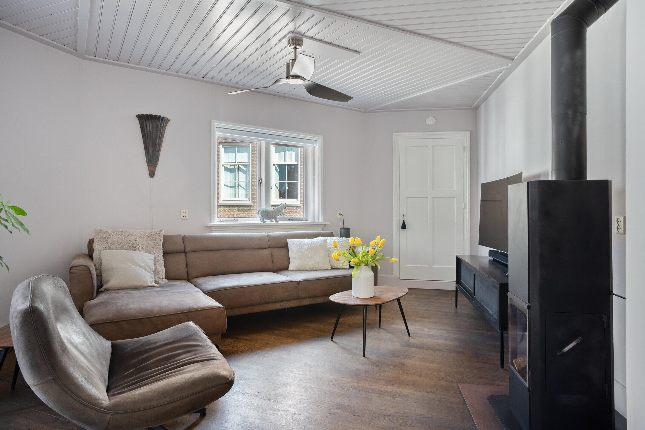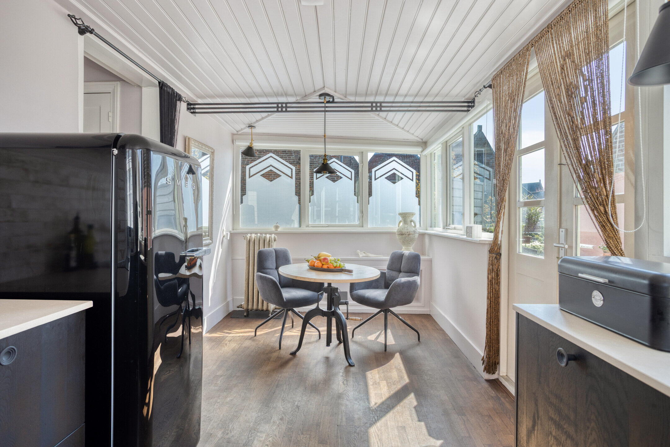 De woonkeuken is licht en biedt volop ruimte voor een eettafel. De keuken is in 2024 vernieuwd en praktisch ingericht met een moderne zwarte hoekopstelling en voorzien van diverse inbouwapparatuur. Via de dubbele deuren stap je zo het dakterras op. Extra comfortabel: de woonkeuken is voorzien van airconditioning die ook kan verwarmen – een zeldzame luxe in de vesting.