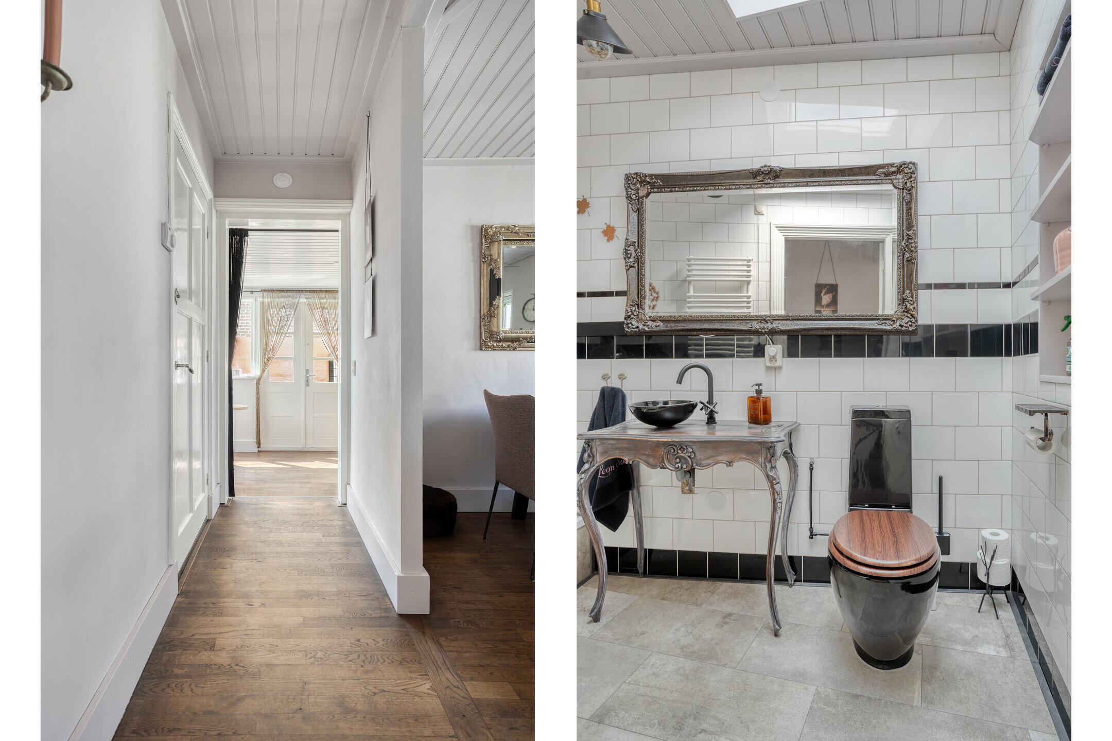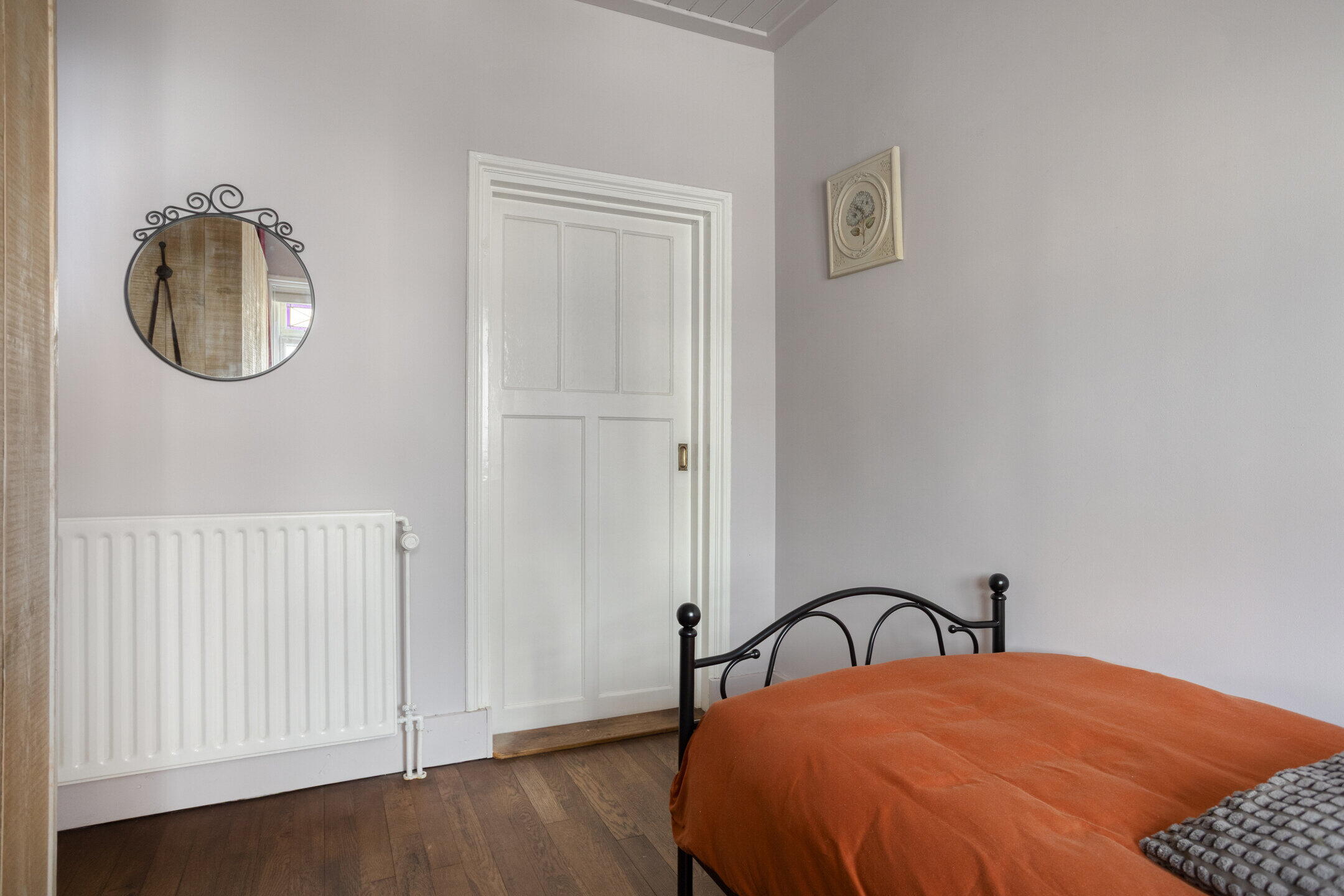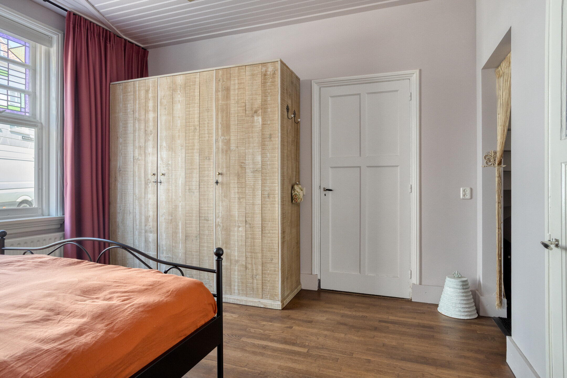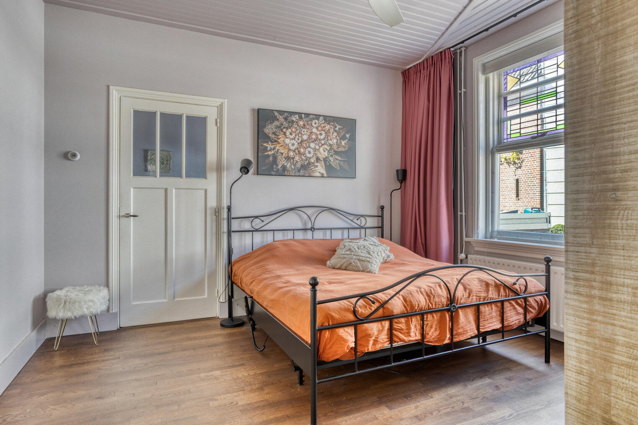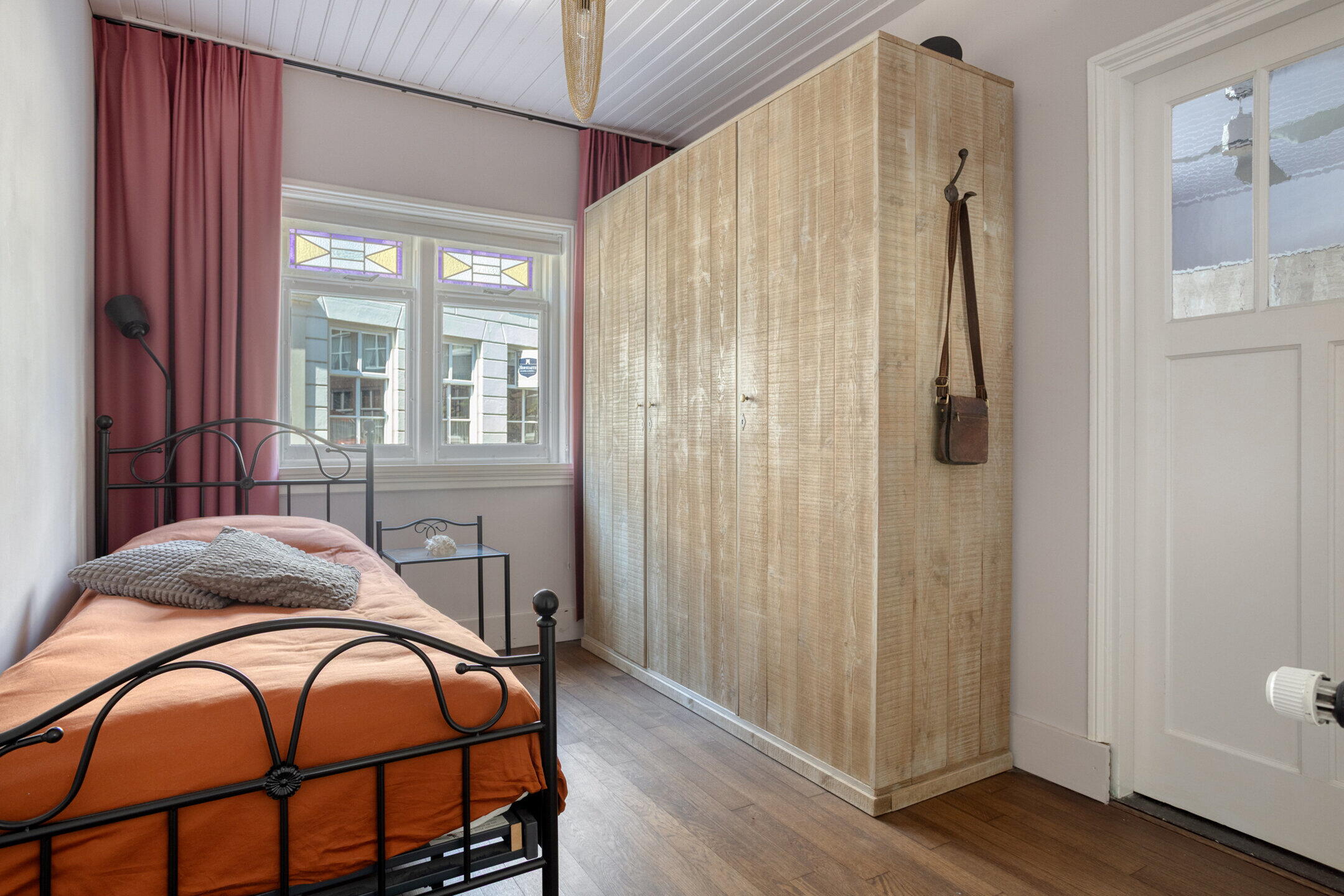Aan de rechterzijde ligt een royale slaapkamer met eigen badkamer. Deze kamer is strak afgewerkt en voorzien van een houten vloer. Via deze kamer bereik je nog een derde (slaap)kamer, eveneens netjes afgewerkt. De badkamer is compleet ingericht met een inloopdouche, toilet en wastafel. Alle kamers op deze verdieping ademen karakter dankzij de glas-in-loodramen en paneeldeuren.