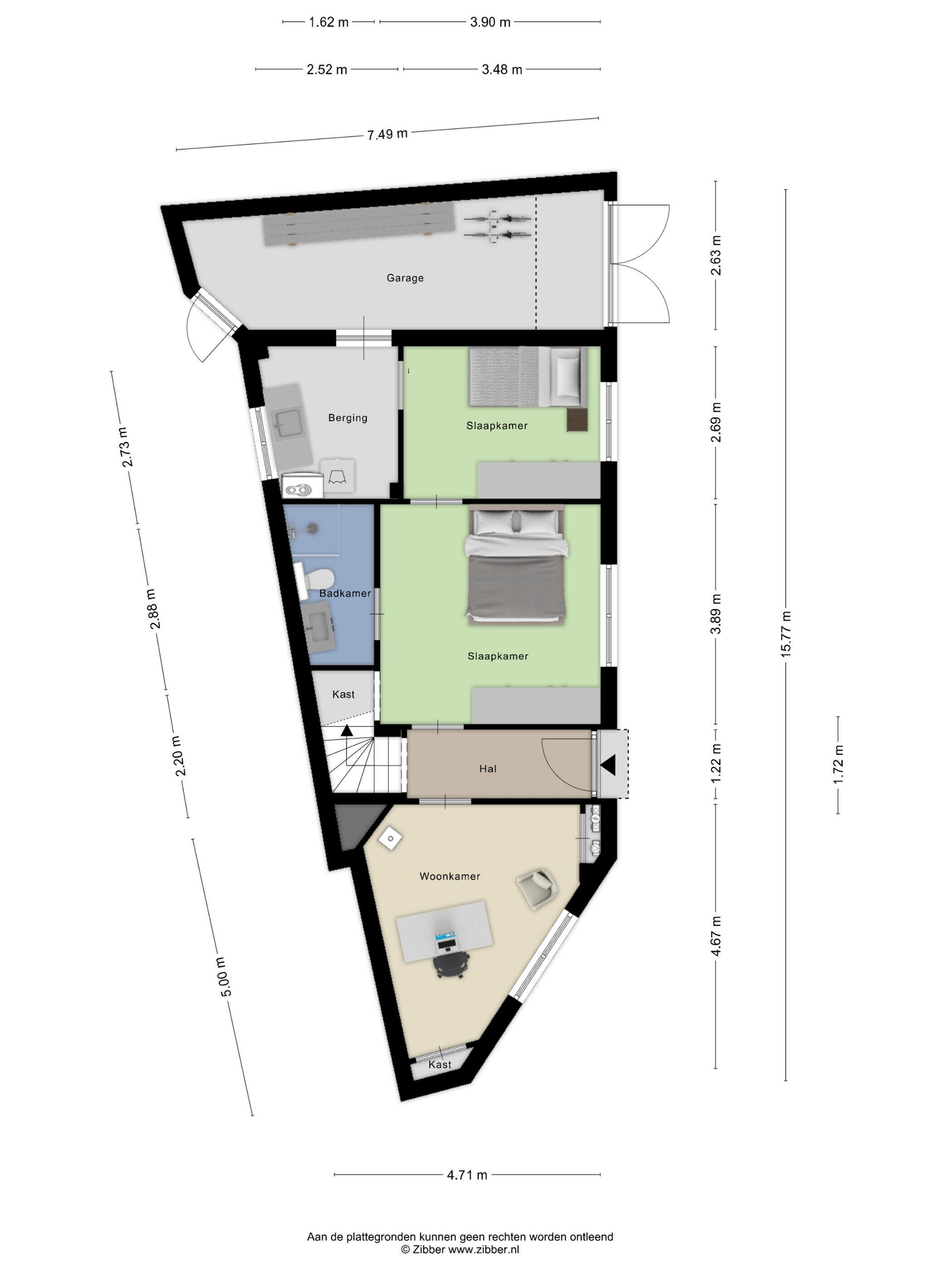 Aansluitend vind je de praktische bijkeuken met aansluitingen voor wasapparatuur en extra bergruimte. Ook is er een inpandige garage/berging met dubbele deuren – ideaal voor hobby, opslag of fietsen.
